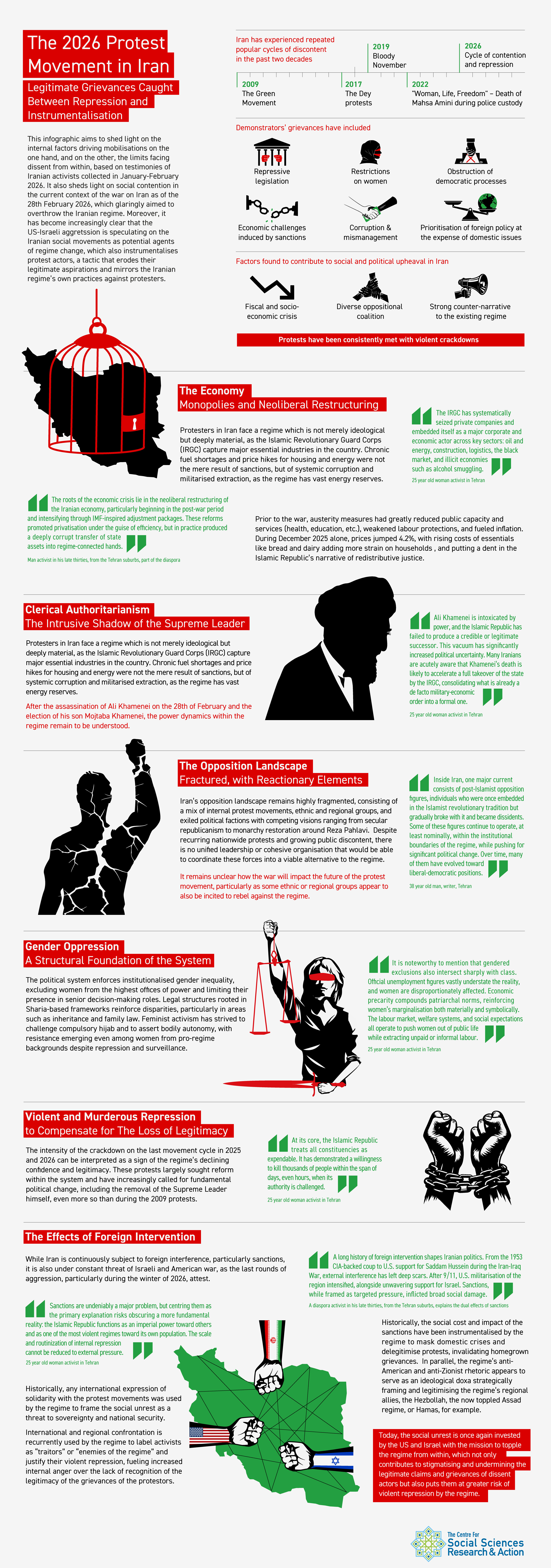This infographic aims to shed light on the internal factors driving mobilisations on the one hand, and on the other, the limits facing dissent from within, based on testimonies of Iranian activists collected in January-February 2026. It also highlights social contention in the current context of the war on Iran as of the 28th February 2026, which glaringly aimed to overthrow the Iranian regime. Moreover, it has become increasingly clear that the US-Israeli aggression is speculating on the Iranian social movements as potential agents of regime change, which also instrumentalises protest actors, a tactic that erodes their legitimate aspirations and mirrors the Iranian regime’s own practices against protesters.